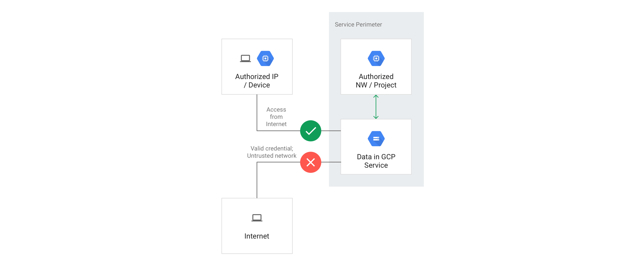Access from the internet to managed resources within a service perimeter is denied by default. Optionally, you can enable access based on the context of the request. To do so, you can create ingress rules or access levels to permit access based on various attributes, such as the source IP address, identity, or source Google Cloud project. If requests made from the internet don't meet the criteria defined in the ingress rule or access level, the requests are denied.